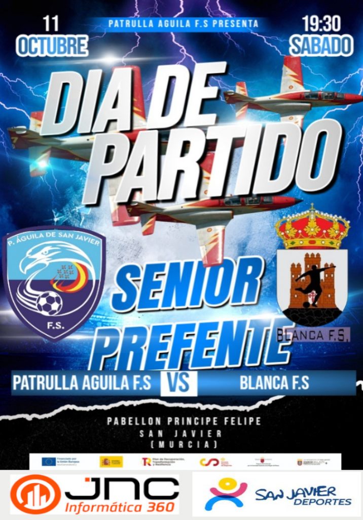 ¡¡¡ÚLTIMA HORA!!!, ¡¡¡ÚLTIMAS NOTICIAS!!!, ¡¡¡NOVEDADES INFORMATIVAS!!! SUSPENDIDOS TODOS LOS PARTIDOS DEL SÁBADO POR LA TARDE EN LAS ZONAS DE LA REGIÓN DE MURCIA EN LAS QUE SE HA ELEVADO EL PLAN INUNMUR A NIVEL 2 Leer más NOTA INFORMATIVA DE LA FFRM SOBRE LA SUSPENSIÓN DE PARTIDOS EN LAS ZONAS CON ALERTA NARANJA Leer más NUESTRO EQUIPO JUVENIL SE ESTRENA MAÑANA EN CASA ANTE EL C.D.ALBACETE F.S. EN LA DIVISIÓN HONOR JUVENIL F.S. Leer más NAWTER/BLANCA F.S. SEGUNDO RIVAL EN CASA DE NUESTRO JNC/PATRULLA ÁGUILA SAN JAVIER F.S. EN ESTA TEMPORADA Leer más Cargar más ASCENSO A DIVISIÓN HONOR JUVENIL TEMPORADA 2022/23 HORARIOS ENTRENAMIENTOS PROXIMOS PARTIDOS RESULTADOS CLASIFICACIONES GALERÍA DE FOTOS PATRULLA ÁGUILA EQUIPOS FEDERADOS COLABORADORES PATROCINADORES