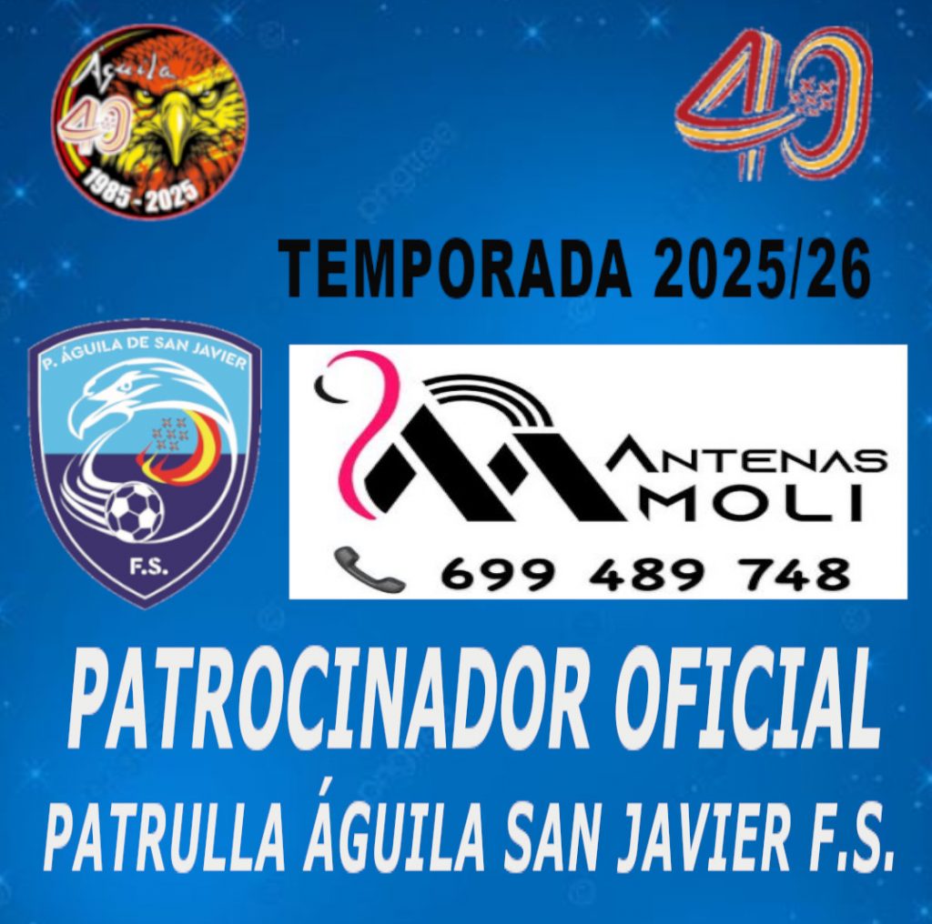 El club Patrulla Águila San Javier F.S. seguirá contando un año más con el patrocinio de Antenas Moli, que además será el patrocinador principal de nuestro equipo en División Honor Cadete F.S. durante esta temporada 2025/26.