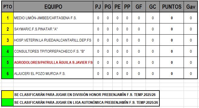 CLASIFICACIÓN FASE PREVIA PREBENJAMÍN F.S. - GRUPO 1 RESULTADOS JORNADA 1ª (18-19 OCTUBRE 2025) CLASIFICACIÓN