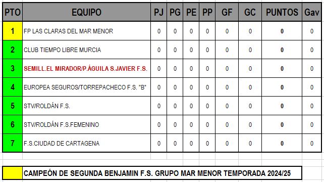 CLASIFICACIÓN SEGUNDA BENJAMÍN F.S. - GRUPO MAR MENOR RESULTADOS JORNADA 1ª (19 NOVIEMBRE 2025) CLASIFICACIÓN