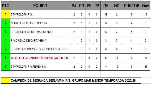 CLASIFICACIÓN SEGUNDA BENJAMÍN F.S. - GRUPO MAR MENOR RESULTADOS JORNADA 2ª (22 NOVIEMBRE 2025) CLASIFICACIÓN