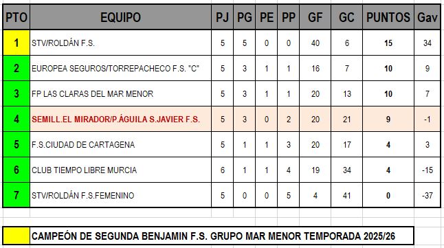 CLASIFICACIÓN SEGUNDA BENJAMÍN F.S. - GRUPO MAR MENOR