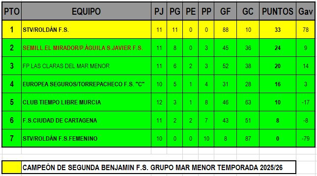 CLASIFICACIÓN SEGUNDA BENJAMÍN F.S. - GRUPO MAR MENOR RESULTADOS JORNADA 13ª (21 MARZO 2026) CLASIFICACIÓN STV/ROLDÁN F.S. SE HA PROCLAMADO CAMPÉON DE LA SEGUNDA BENJAMÍN F.S. - GRUPO MAR MENOR EN ESTA TEMPORADA 2025/2026