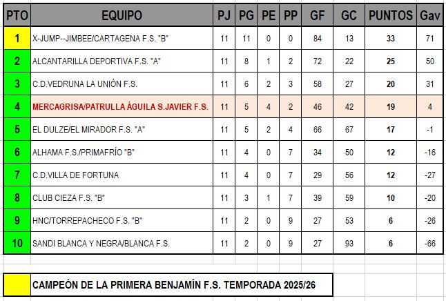 CLASIFICACIÓN PRIMERA BENJAMÍN F.S. - GRUPO ÚNICO RESULTADOS JORNADA 11ª (28 FEBRERO - 01 MARZO 2026) CLASIFICACIÓN