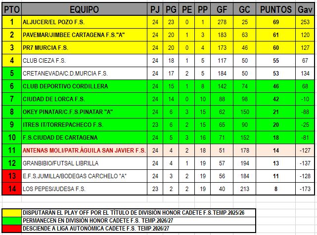 CLASIFICACIÓN DIVISIÓN HONOR CADETE F.S. - GRUPO ÚNICO