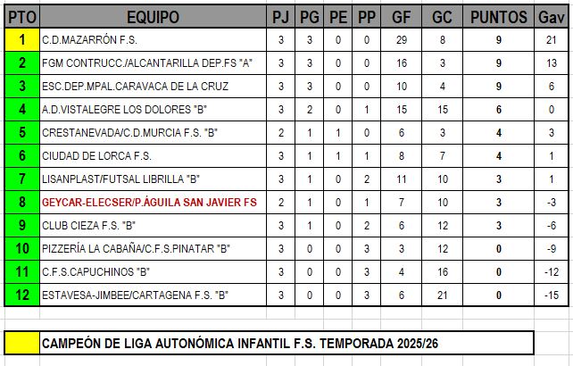 CLASIFICACIÓN LIGA AUTONÓMICA INFANTIL F.S. - GRUPO ÚNICO RESULTADOS JORNADA 3ª (29-30 NOVIEMBRE 2025) CLASIFICACIÓN