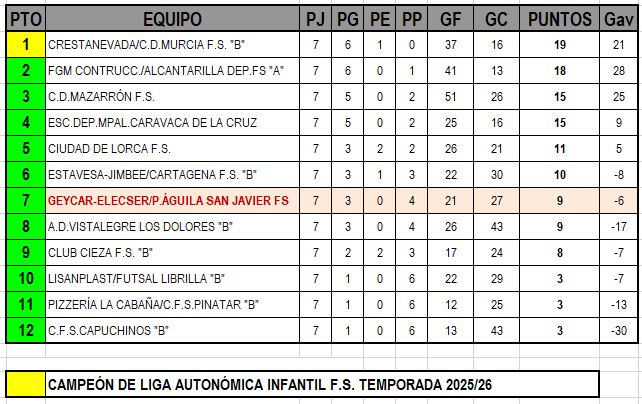 CLASIFICACIÓN LIGA AUTONÓMICA INFANTIL F.S. - GRUPO ÚNICO RESULTADOS JORNADA 7ª (10-11 ENERO 2026) CLASIFICACIÓN