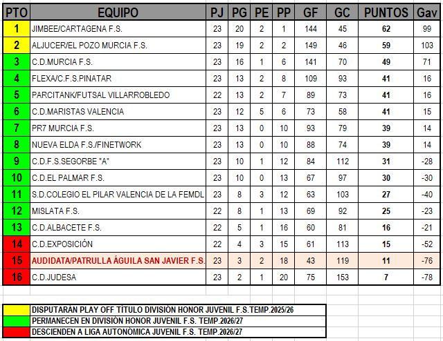 CLASIFICACIÓN DIVISÓN HONOR JUVENIL F.S. - GRUPO 7 RESULTADOS JORNADA 23ª (11-12 ABRIL 2026) CLASIFICACIÓN