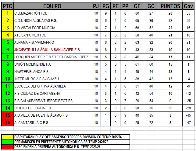 CLASIFICACIÓN PREFERENTE AUTONÓMICA F.S. - GRUPO ÚNICO RESULTADOS JORNADA 10ª (22-23 NOVIEMBRE 2025) CLASIFICACIÓN