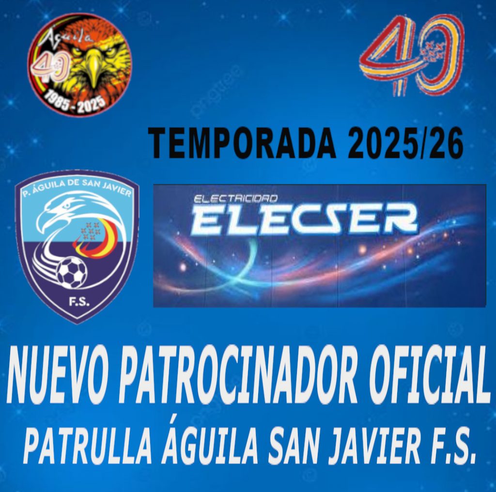 La empresa Electricidad Elecser será patrocinador oficial del club Patrulla Águila San Javier durante esta temporada 2025/2026. Además, Electricidad Elecser será uno de los patrocinadores oficiales de nuestro equipo Infantil, que disputará el Campeonato Regional Infantil de fútbol sala en esta temporada 2025/26.