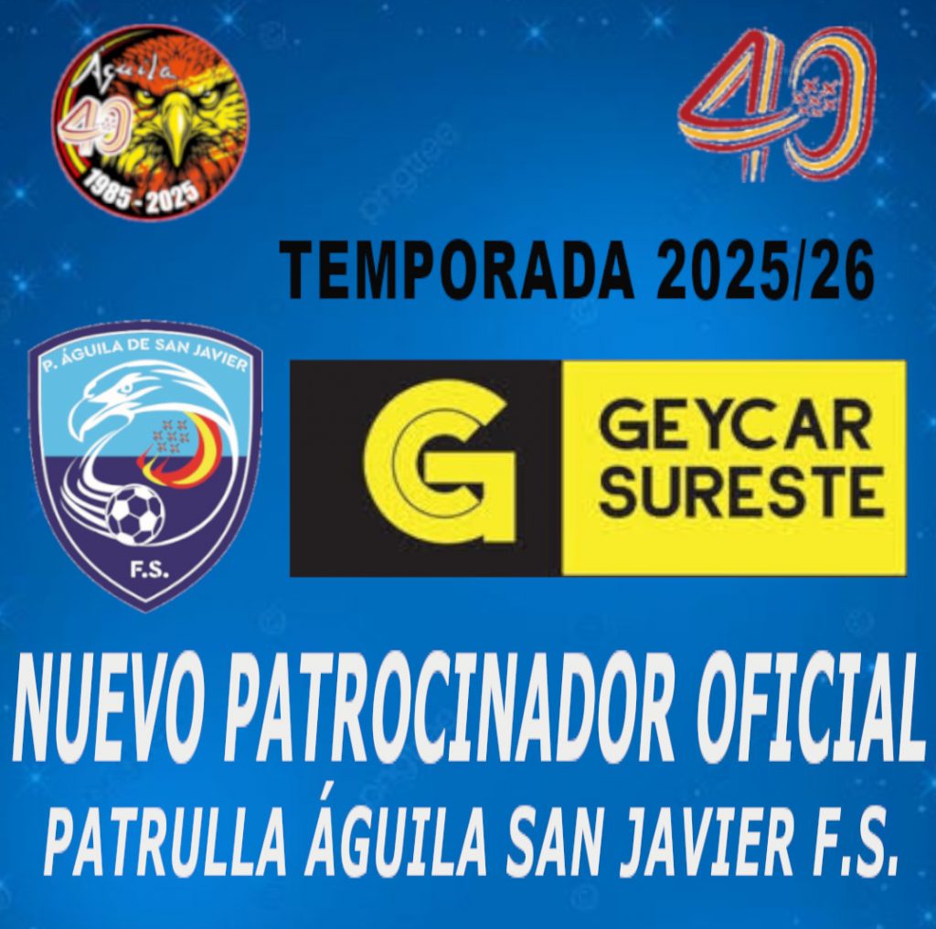 La empresa GEYCAR SURESTE será patrocinador oficial del club Patrulla Águila San Javier durante esta temporada 2025/2026. Además, GEYCAR SURESTE será uno de los patrocinadores oficiales de nuestro equipo Infantil, que disputará el Campeonato Regional Infantil de fútbol sala en esta temporada 2025/26.