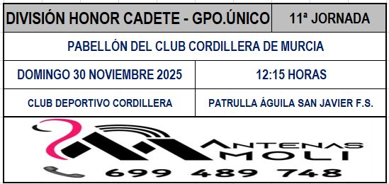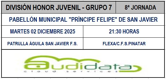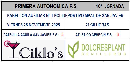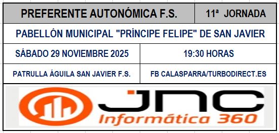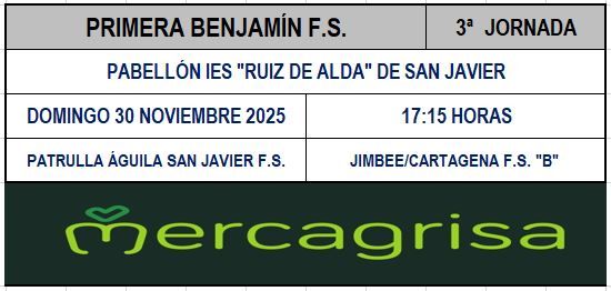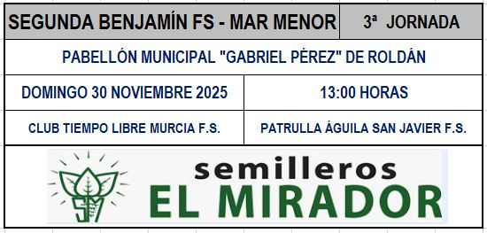 Nov 29, 2025Óscar Ramón Sanchez Saez´BENJAMÍN "B", ALEVIN, BENJAMIN, CADETE, CLUB, EQUIPO SORDOS, FFRM, INFANTIL, JUVENIL, NOTICIAS, PREBENJAMIN, SENIOR "A", SENIOR "B" HORARIOS PARTIDOS PATRULLA ÁGUILA SAN JAVIER F.S. (FIN DE SEMANA 29-30 NOVIEMBRE) COLABORADORES PATROCINADORES