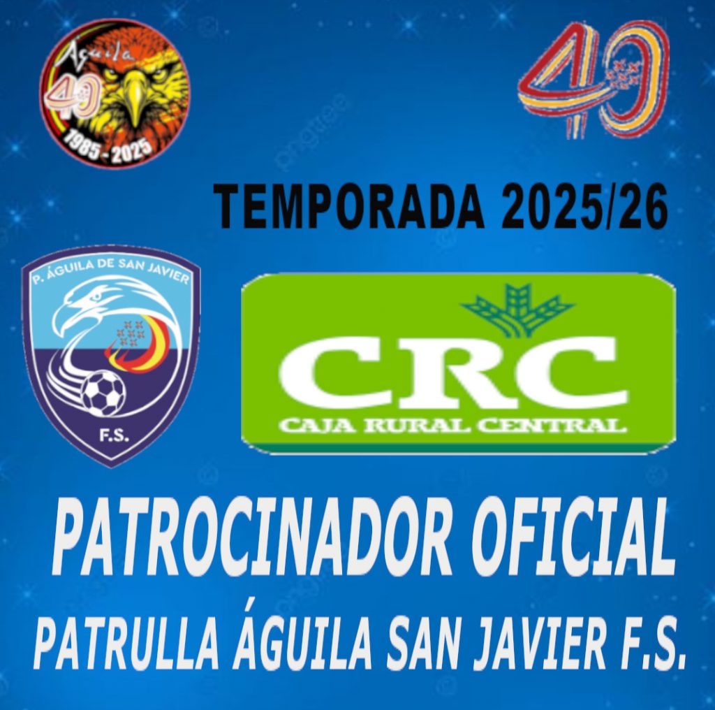 El club Patrulla Águila San Javier F.S. seguirá apoyado como patrocinio, otra temporada más, por La Caja Rural Central, con lo que este banco demuestra un año mas su compromiso con el deporte base de San Javier, y más concreto con el fútbol sala.