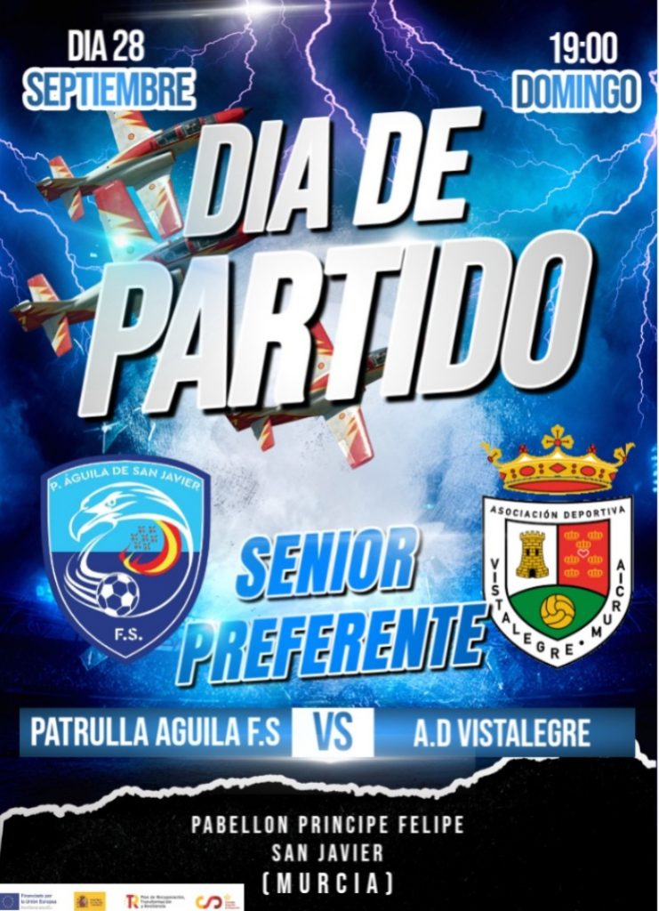 Nuestro equipo de Preferente Autonómica F.S., Patrulla Águila San Javier F.S./JNC jugará el primer partido en casa mañana domingo 28 de Septiembre a las 19:00 horas en el Pabellón «Príncipe Felipe» de San Javier, ante el A.D.Vistalegre Los Dolores.