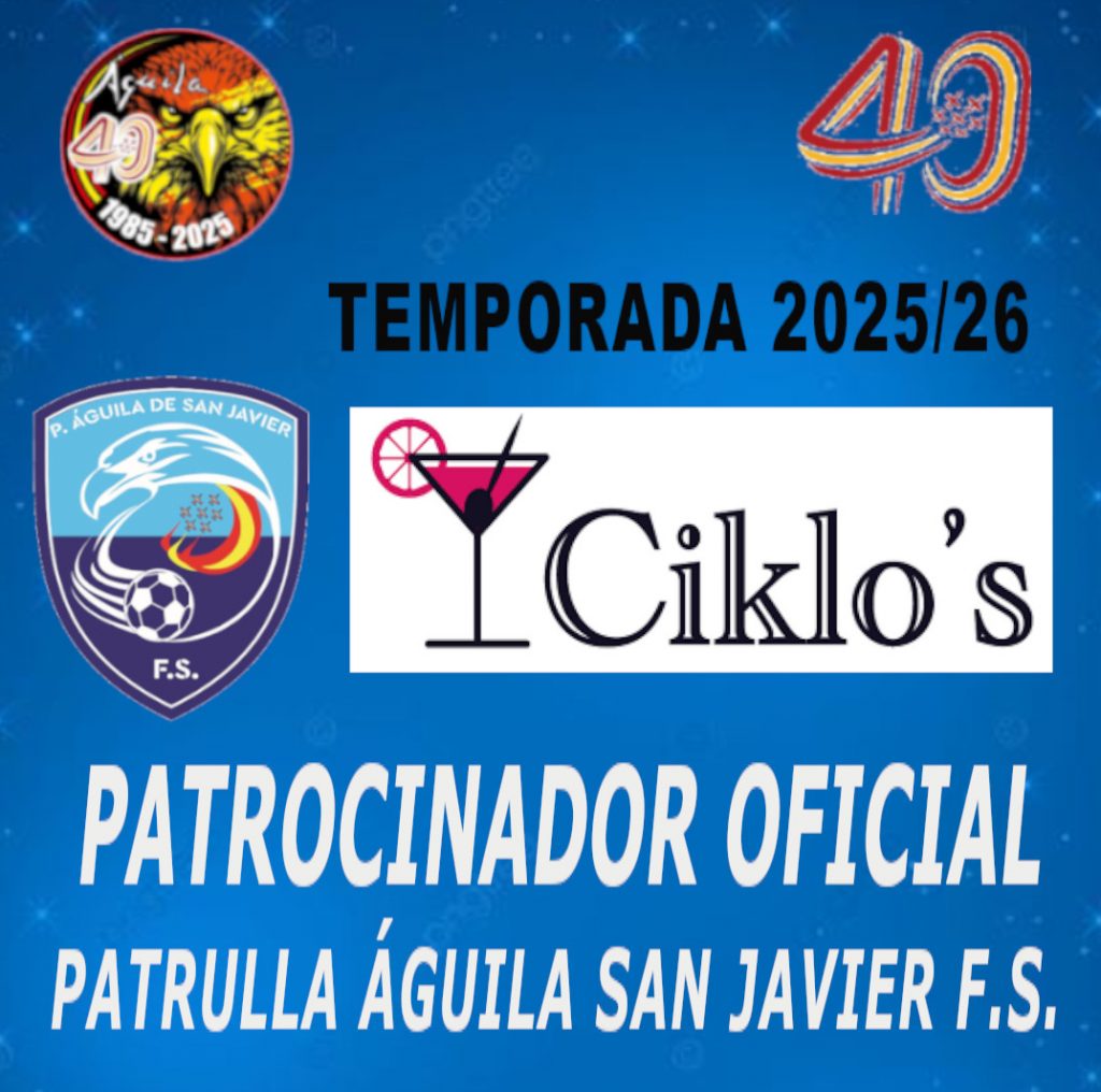 El club Patrulla Águila San Javier F.S. continuará otro año más con el patrocinio de Pub Ciklo´S, este prestigioso local de San Javier que lleva más de 32 años ofreciendo un punto de encuentro, diversión, ocio y el mejor ambiente de la Comarca del Mar Menor. más importante de la Comarca del Mar Menor. Pub Ciklo´S está entre el elenco de empresas locales que han apoyado a nuestro club desde su fundación y además será uno de los dos patrocinadores oficiales de nuestro equipo filial senior que jugará en Primera Autonómica F.S. esta temporada 2025-26.