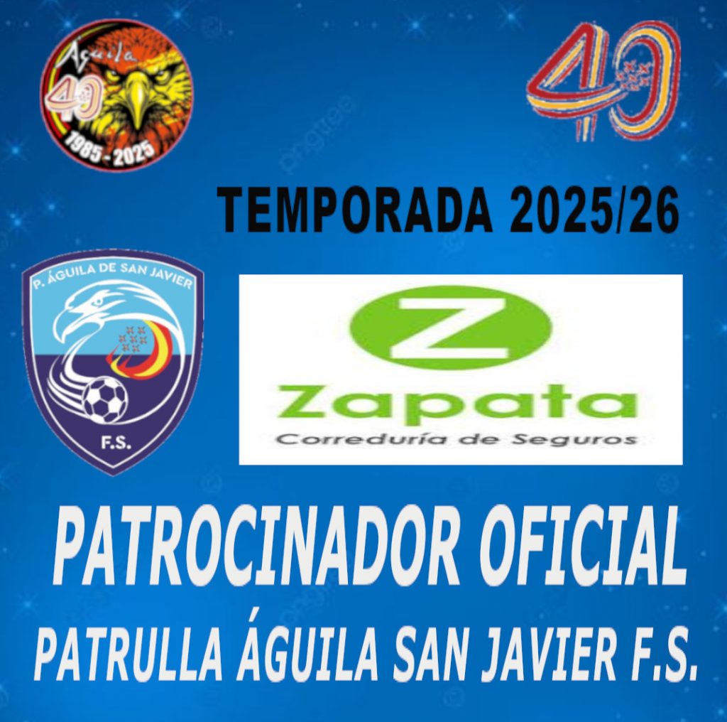 Seguros Zapata es una Correduría de Seguros afincada en San Javier que ha patrocinado al club Patrulla Águila San Javier F.S. todos los años desde que se fundó el club, y este año no iba a ser menos. Seguros Zapata seguirá un año más como patrocinador oficial del club Patrulla Águila San Javier F.S.